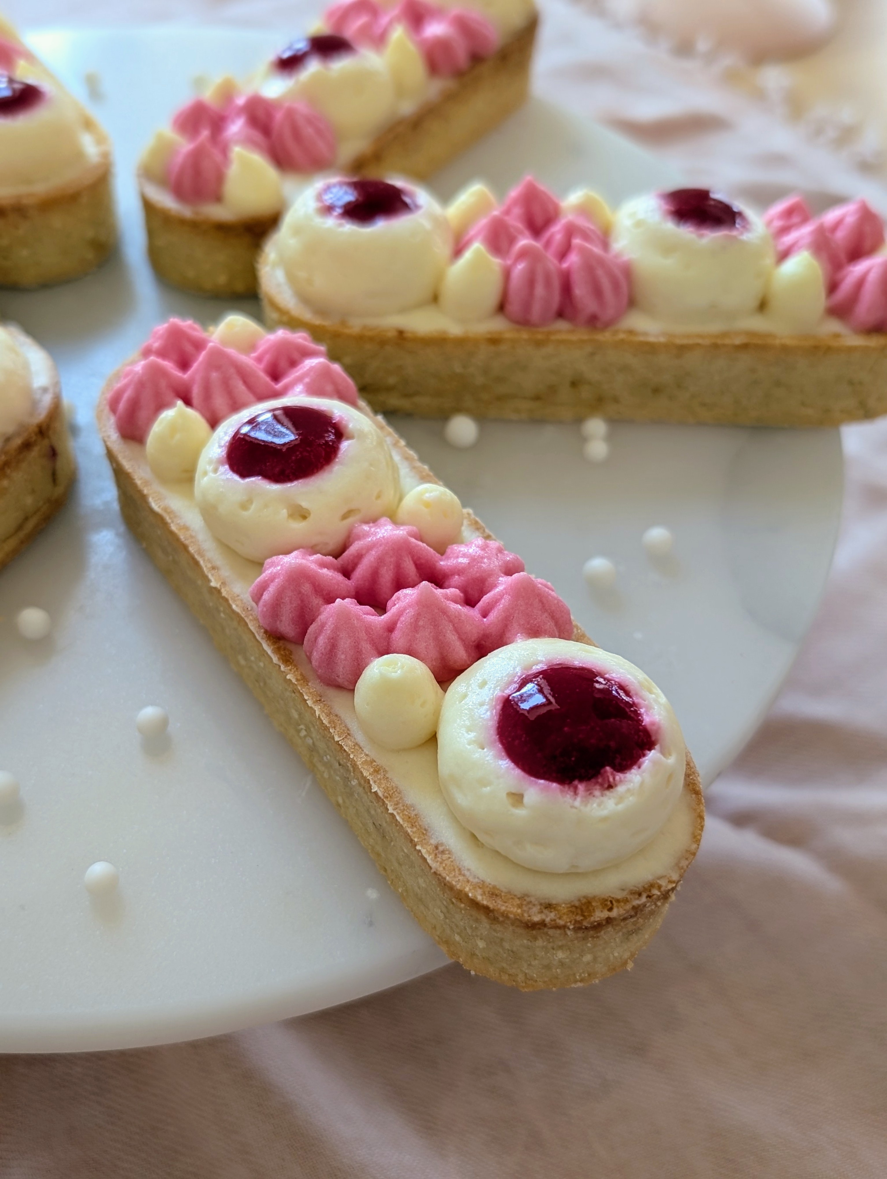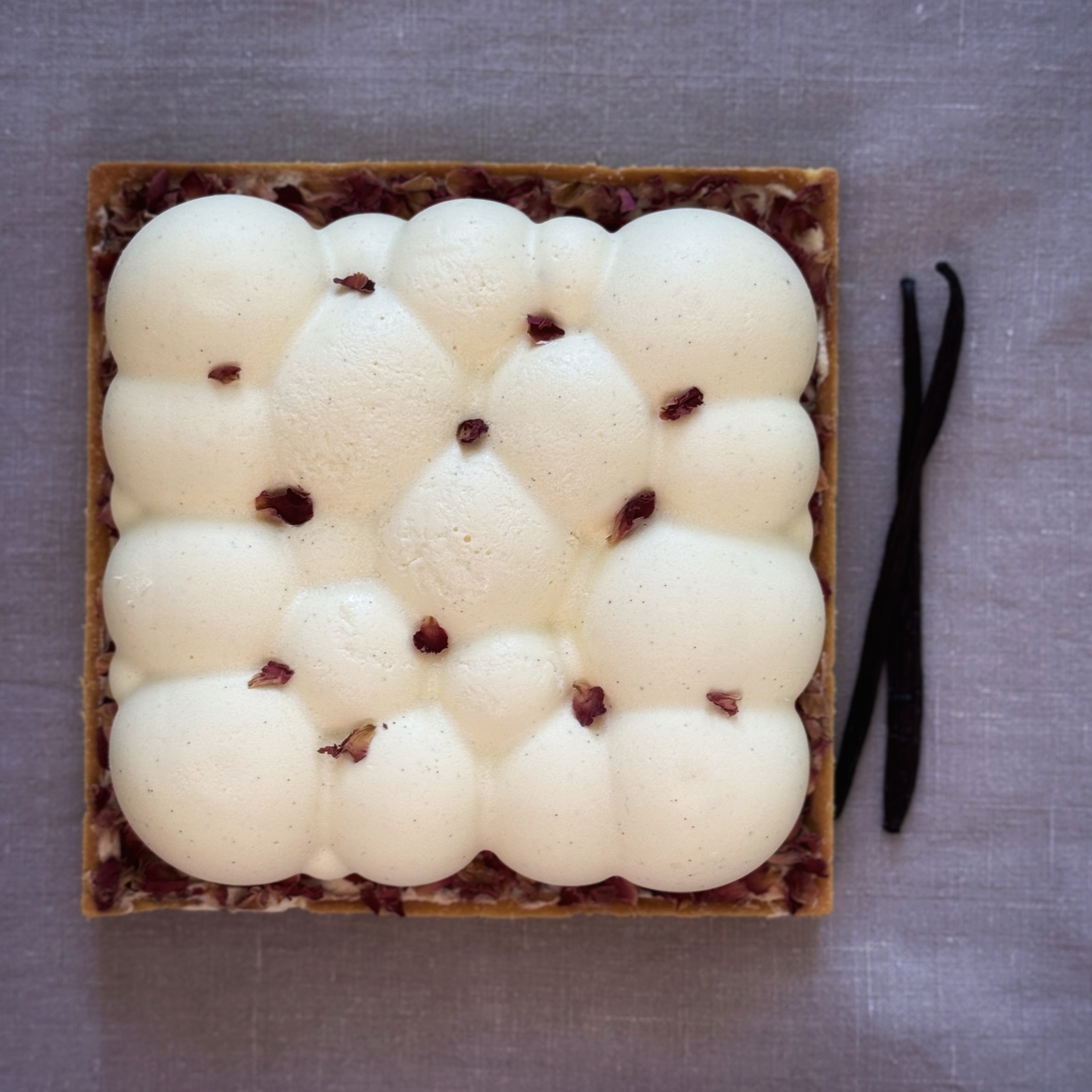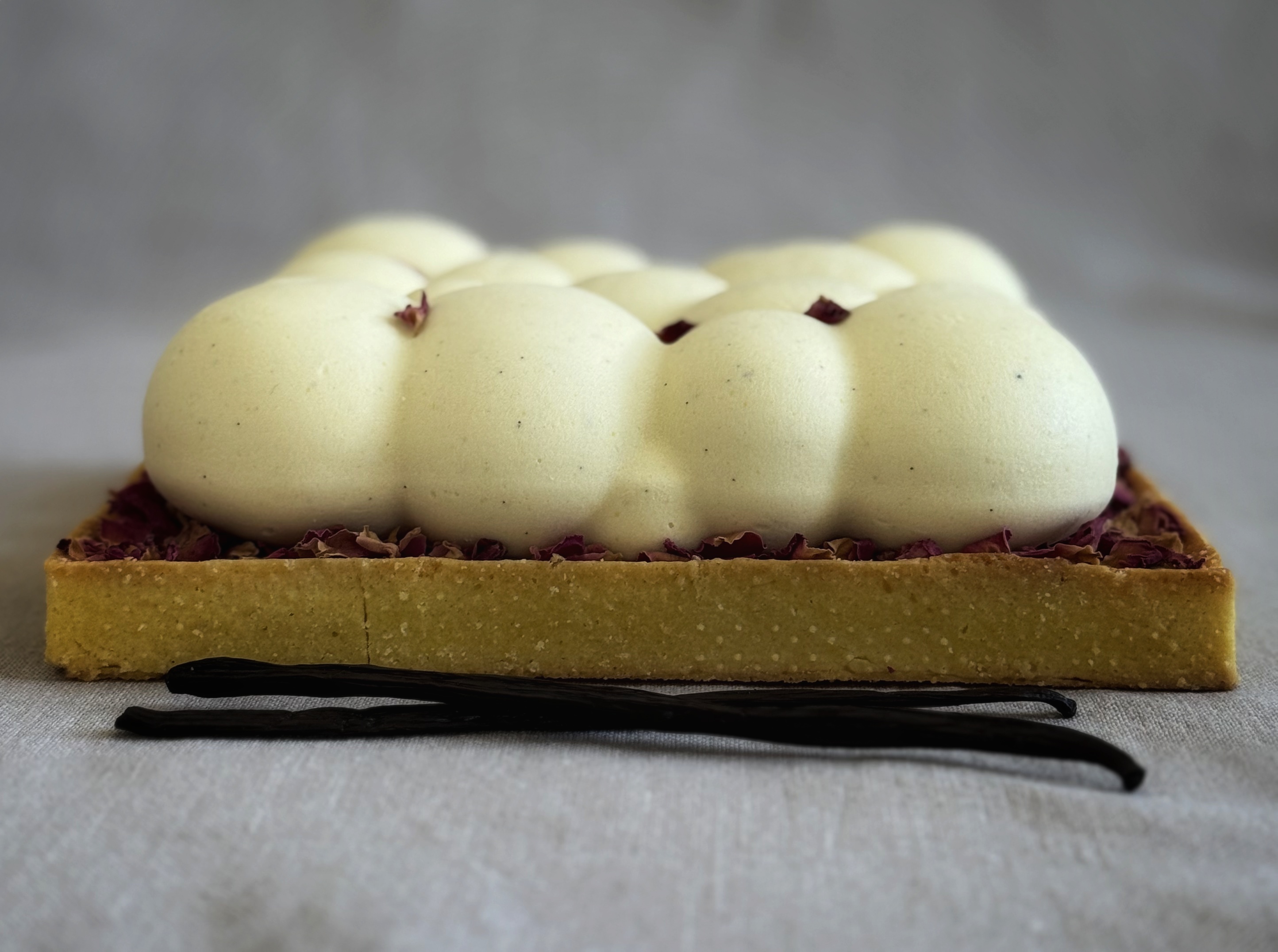 Ta elegancka tarta to wyrafinowana kompozycja smaków i tekstur. Jej podstawę stanowi klasyczne, kruche ciasto, wypieczone na złoto, które stanowi doskonałe tło dla owocowego wnętrza. Wypełnienie to aromatyczny rabarbarowo-różany wkład – lekko kwaskowaty, z nutą kwiatowej delikatności, który wnosi świeżość i charakter. Zwieńczona jest chmurka z kremu pâtissière – gładki, waniliowy, jedwabisty, który nadaje całości kremowej głębi i elegancji.